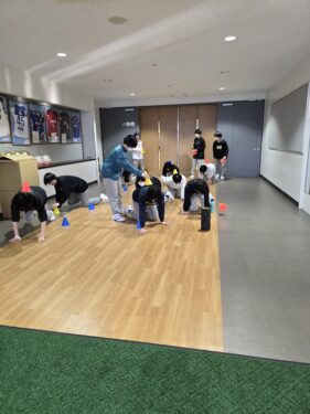 2月の映像です。女子バスケットボール部の生徒が体育館の入口付近で体幹を鍛えるトレーニングしていました。