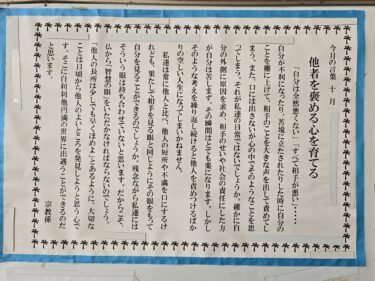 また、昇降口の掲示板には、教頭兼宗教科主任の先生が【今月の言葉】を掲示して、情操教育に勤めています。