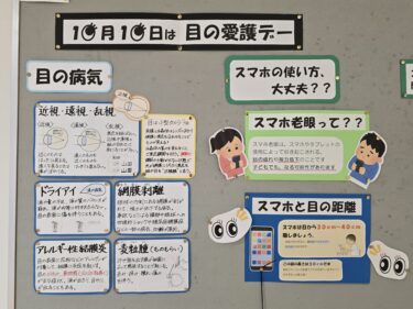 今月は、保健室前の掲示板では、10/10が【目の愛護デー】であることから、①目の病気 ②スマホの使い方 ③スマホ老眼を防ぐためにできること について、