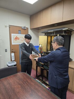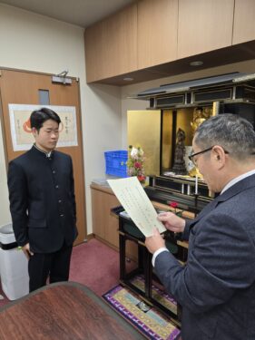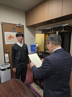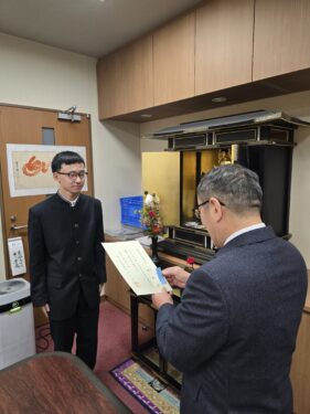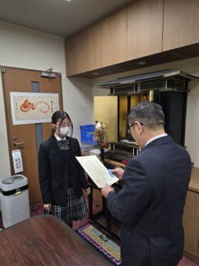 認可されるには様々な条件をクリアする必要があります。前期の中間試験や期末試験も考慮されます。過日1年生から3年生まで各学年2名ずつ、計6名の生徒に対してその伝達式を校長室で行いました。