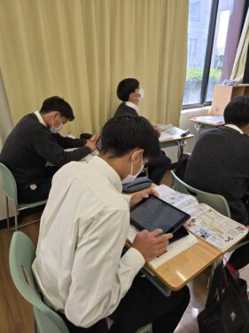 政経は現代社会を知る上で新聞を活用していました。また、入試論文の対応の仕方を説明していました。