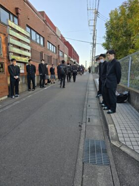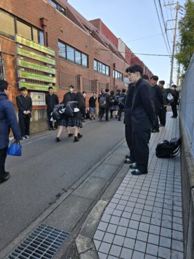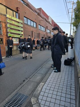 11/20の朝の登校の様子です。1年生のTAC クラスの生徒たちが担任の先生とともに「見守り」をしていてくれました。