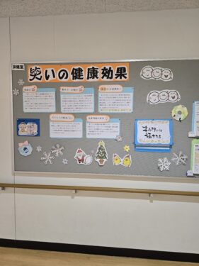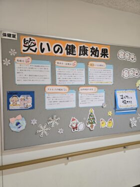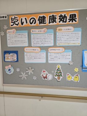 保健の先生が「笑いの健康効果」について保健室前の掲示板で説明していました。12月の掲示板です。