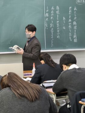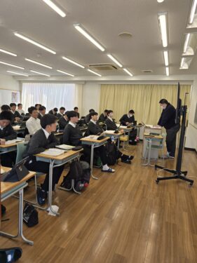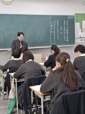 国語は時間でやるべきことをしっかりと管理しているとてもテンポのよい授業でした。作者について生徒に適切な情報を与えて入試にも対応できるようにしていました。