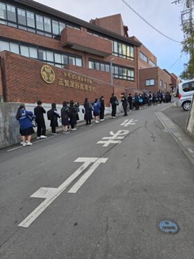 集合時間が近づくと多くの受験生が元気に集まりました。