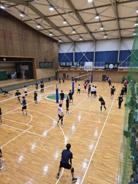 体育館では男子バレーボール部、男子バスケットボール部、女子バスケットボール部が大きな声を出しながら気合いの入った練習や練習試合を行っていました。中庭ではテニス部が練習していました。