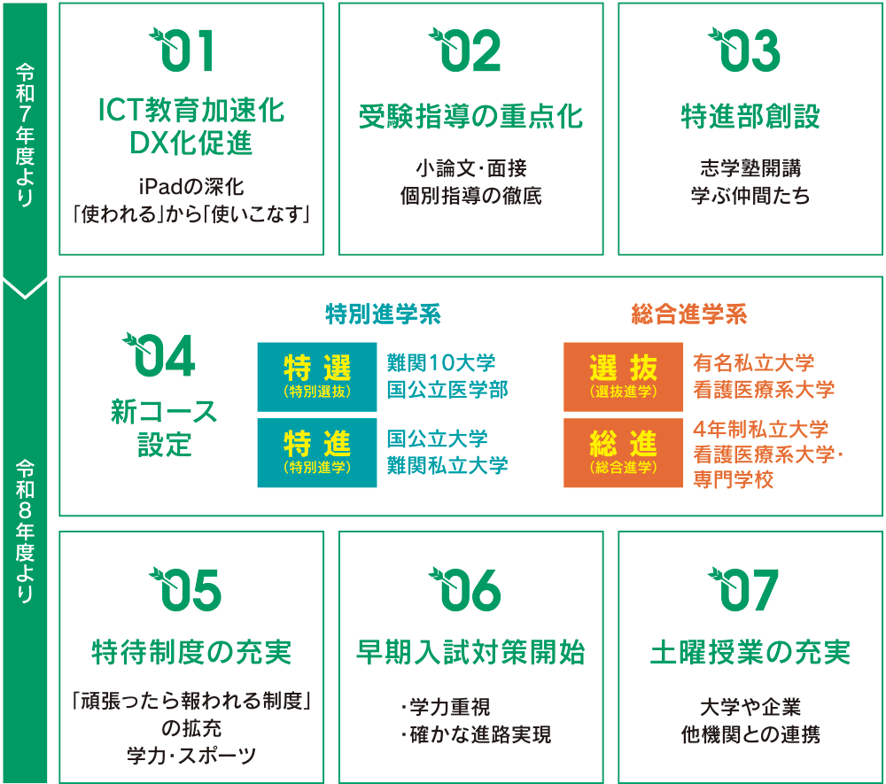 これまで学業の充実と学校行事や部活動の推進に取り組んできました。結果として、特進を中心とした生徒が国公立大学や難関私立大学にも進学してきました。特別活動では全国レベルで活躍する生徒も多数います(令和6年度、女子卓球部、男子バスケットボール部、サッカー部、弓道部、生物研究会が全国レベルで活躍)。今後は、学業と部活動等の特別活動の両立を図ることはもちろんのこと、多様化(ダイバーシティー)と包摂性(インクルージョン)といった今後必要とされる視点にも力を入れながら、これまで以上に積極的に生徒全体の学力の増進にも努めていきます。